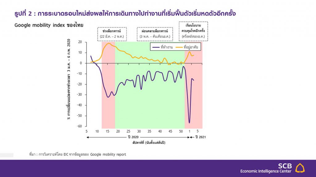 ทั้งนี้ ในการระบาดรอบใหม่ตั้งแต่ปลายปี 2020 ส่งผลให้หลายบริษัทจำเป็นที่จะต้องกลับไปใช้นโยบายในการ work from home อีกครั้ง ส่งผลให้แนวโน้มการเดินทางไปทำงานเริ่มหดตัวอีกครั้งหนึ่ง สะท้อนได้จาก Google mobility index ของไทย ซึ่งเป็นดัชนีที่แสดง traffic ของการเดินทางไปยังสถานที่ประเภทต่าง ๆ ของผู้ใช้บริการ Google พบว่า ในช่วงที่มีมาตรการล็อกดาวน์ การเดินทางไปที่ทำงานลดลงอย่างมาก