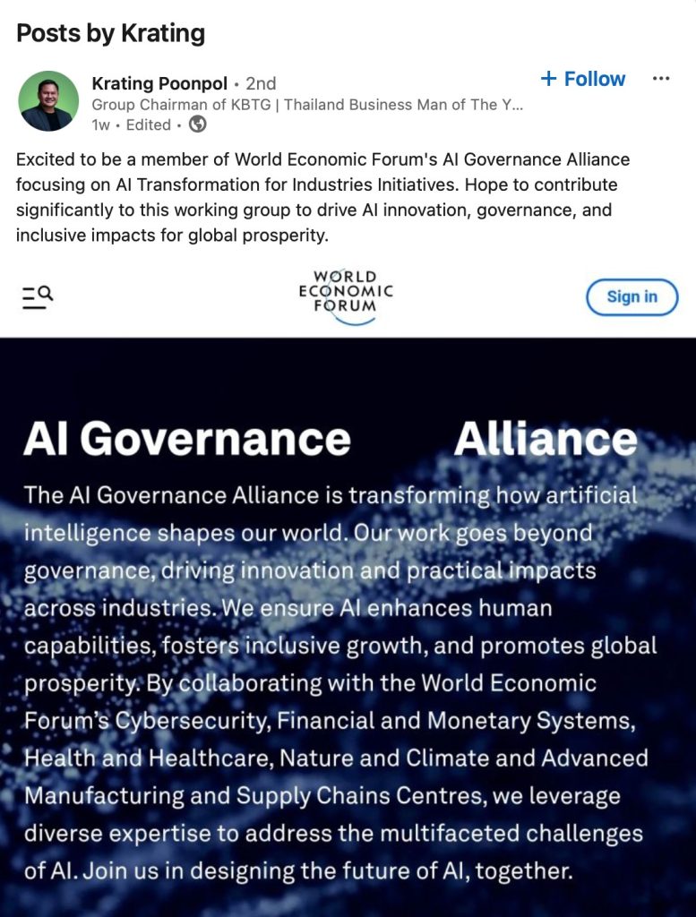 กระทิง เรืองโรจน์ พูนผล ร่วมเป็น AI Governance Alliance ของ World Economic Forum และ Forbes Business Council