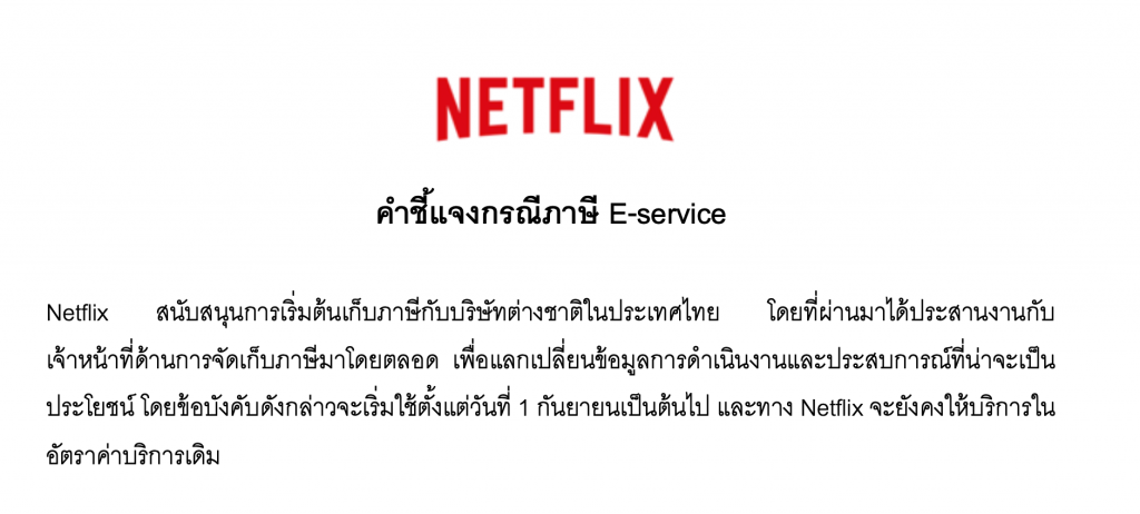 พรบ. e-serivces ให้บริษัทต่างชาติที่ให้บริการแพลตฟอร์มแก่ผู้บริโภคในไทยและมียอดขายบริการเกิน 1.8 ล้านบาทต่อปี จะต้องมาจดทะเบียนภาษีมูลค่าเพิ่ม และนำส่งภาษีมูลค่าเพิ่มให้กับประเทศไทยเหมือนกับผู้ประกอบการไทยที่ให้บริการประเภทเดียวกัน