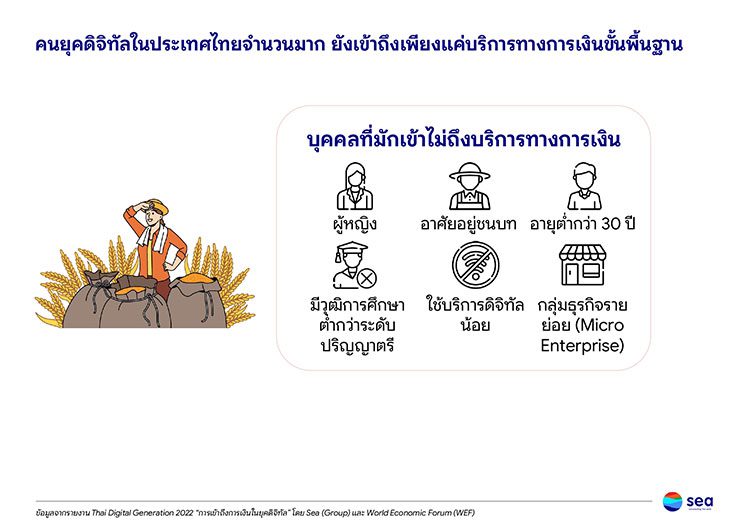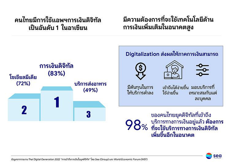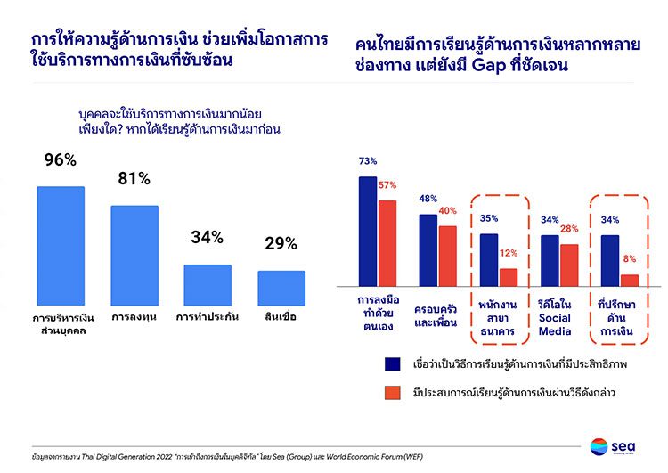 เมื่อเจาะลึกลงไปในสถานการณ์การเข้าถึงบริการทางการเงินในยุคดิจิทัลของไทย ผ่านข้อมูลอินไซต์จาก รายงาน “Thai Digital Generation Survey 2022” สำรวจความคิดเห็นคนไทยกว่า 8,400 คน ที่ 51% เป็นคนรุ่นใหม่ อายุ 16-35 ปี และยังมีส่วนของผู้ประกอบการ MSMEs อีกประมาณ 1,400 คน เพื่อมุ่งทำความเข้าใจด้านการเงินของคนไทย ผ่าน 4 คําถามหลัก 1) การเงินในอุดมคติหน้าตาเป็นอย่างไร? 2) เทรนด์การเงินดิจิทัลของไทยเป็นอย่างไรหลังโควิด? 3) การเข้าถึงบริการทางการเงินยังมีช่องว่างตรงไหนบ้าง? เพราะอะไร? และ 4) ความรู้ด้านการเงินของคนยุคดิจิทัลมีแค่ไหน? เรียนรู้จากที่ใด?