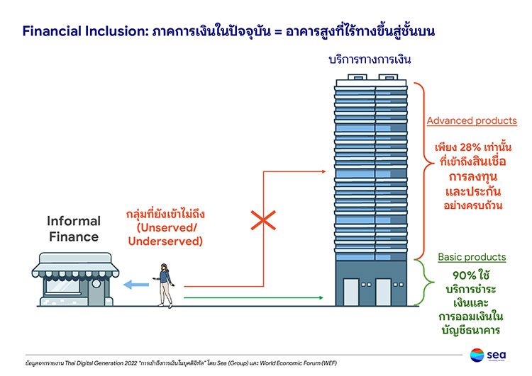 ภาคการเงินในปัจจุบันเปรียบเสมือนอาคารสูงที่เป็นตัวแทนของบริการทางการเงินชั้นล่างคือผลิตภัณฑ์การเงินขั้นพื้นฐานซึ่งคนไทย 90% พอที่จะเข้าถึงได้มีบัญชีเงินฝาก บริการโอนเงิน ชำระเงิน มี Wallet เปิดแอปฯสแกน QR Code สะดวกสบาย ส่วนชั้นสูงขึ้นไปของอาคาร มีผลิตภัณฑ์ประเภทสินเชื่อ การลงทุน และประกัน พบว่ามีคนเข้าถึงน้อยกว่า 30%