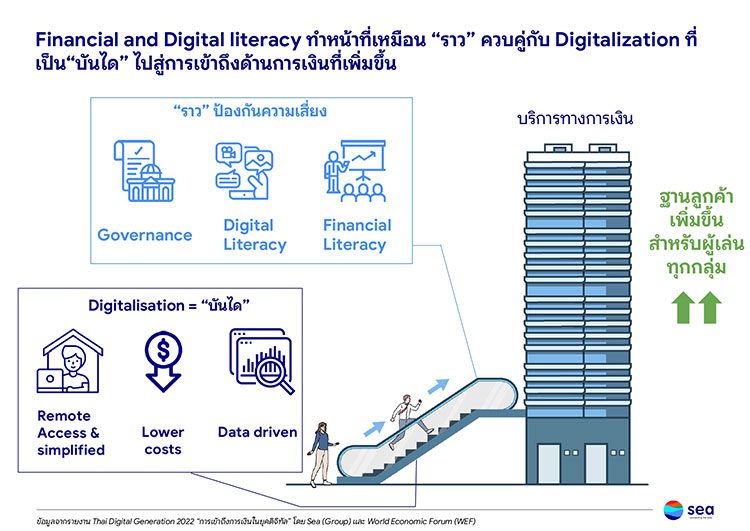 แต่การใช้เทคโนโลยีอย่างเดียวก็ไม่สามารถตอบโจทย์การเข้าถึงบริการทางการเงินได้ทั้งหมดในยุคที่บริการทางการเงินถูกปรับเป็นรูปแบบดิจิทัลมากขึ้นนอกจากการรักษาความปลอดภัยข้อมูลอย่างรัดกุมแล้วยังต้องส่งเสริมให้ผู้คนมีทั้งความรู้ทางด้านการเงิน (financial literacy) และทักษะดิจิทัล (digital literacy) ควบคู่กันเพื่อทําหน้าที่เป็น “ราวบันได” ที่ป้องกันคนไทยจากความเสี่ยงและภัยต่างๆให้สามารถเข้าถึงบริการทางการเงินได้แบบมีภูมิคุ้มกันตัวเอง