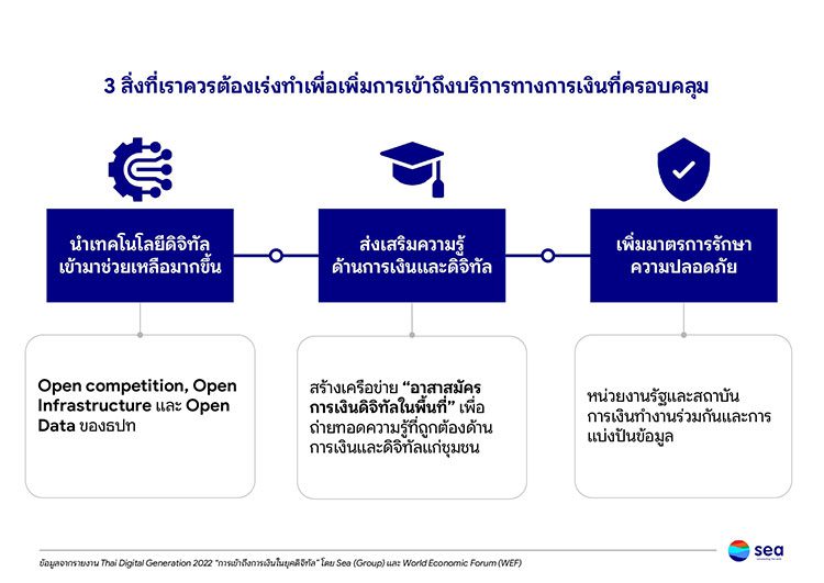 สิ่งที่คนไทยเรียนรู้จากผลสำรวจนี้ และสามารถนำมาใช้เป็นกุญแจสำคัญเพื่อให้ทุกคนเข้าถึง บริการทางการเงินได้ดีขึ้น โดยการนำเทคโนโลยีดิจิทัล (Digitalization) มาใช้เป็น “บันได” เพื่อนําไปสู่การเข้าถึงบริการทางการเงิน ใน “ชั้นที่สูงขึ้น” ได้ เพราะเทคโนโลยีทำให้คนเข้าถึงบริการที่ไหน เวลาใดก็ได้ สอง ช่วยลดต้นทุนให้ถูกลง ทำให้เข้าถึงง่ายขึ้น และสามเป็นการใช้ข้อมูลมาช่วยยกระดับการพัฒนาบริการทางการเงินรูปแบบใหม่ ๆ ที่สอดคล้องกับผู้ใช้บริการ
