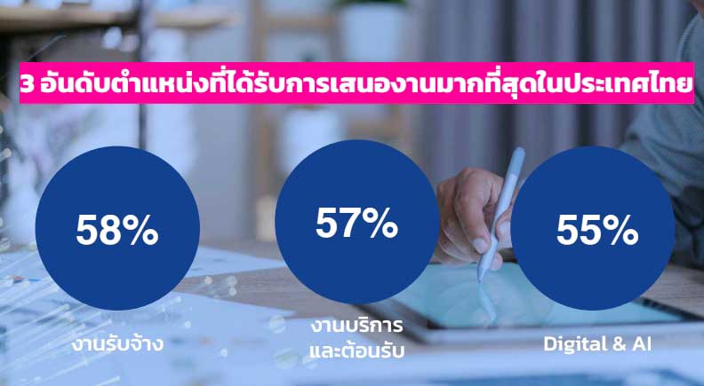 ทั้งนี้ ตลาดแรงงานไทยนับเป็นประเทศเดียวในภูมิภาคที่ตำแหน่งงานที่ได้รับการเสนองานบ่อยเป็นอันดับ 1 ไม่ใช่สายงานด้านไอที แต่เป็นสายงานผู้ใช้แรงงาน (58%) และภาคธุรกิจบริการ (57%)
