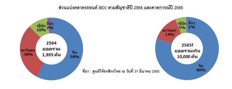 ส่งผลให้ ศูนย์วิจัยกสิกรไทยคาดการณ์ว่า ปี 2565 นี้ รถยนต์ BEV สัญชาติจีน จะมีโอกาสสร้างส่วนแบ่งตลาดเพิ่มขึ้นจาก 58% ของยอดขายรถยนต์ BEV รวมในปีที่แล้วขึ้นเป็นกว่า 80% ในปีนี้ จากยอดขายรถยนต์ BEV รวมที่คาดว่าจะมีมากกว่า 10,000 คัน ขยายตัวมากกว่า 412.0%(YoY) หลังปีที่แล้วจดทะเบียนกับกรมการขนส่งทางบกที่ 1,954 คัน โดยกลุ่มผู้ซื้อหลักนอกจากเป็นกลุ่มที่มีกำลังซื้อและได้รับผลกระทบน้อยจากภาวะเศรษฐกิจแล้ว อีกกลุ่มที่ช่วยดันยอดให้ขึ้นสู่ตัวเลขดังกล่าว น่าจะเป็นกลุ่มลูกค้า Fleet องค์กรทั้งภาครัฐและเอกชนซึ่งมีศักยภาพในช่วงที่ตลาดผู้บริโภคส่วนใหญ่กำลังเผชิญกับภาวะกำลังซื้อชะลอลง