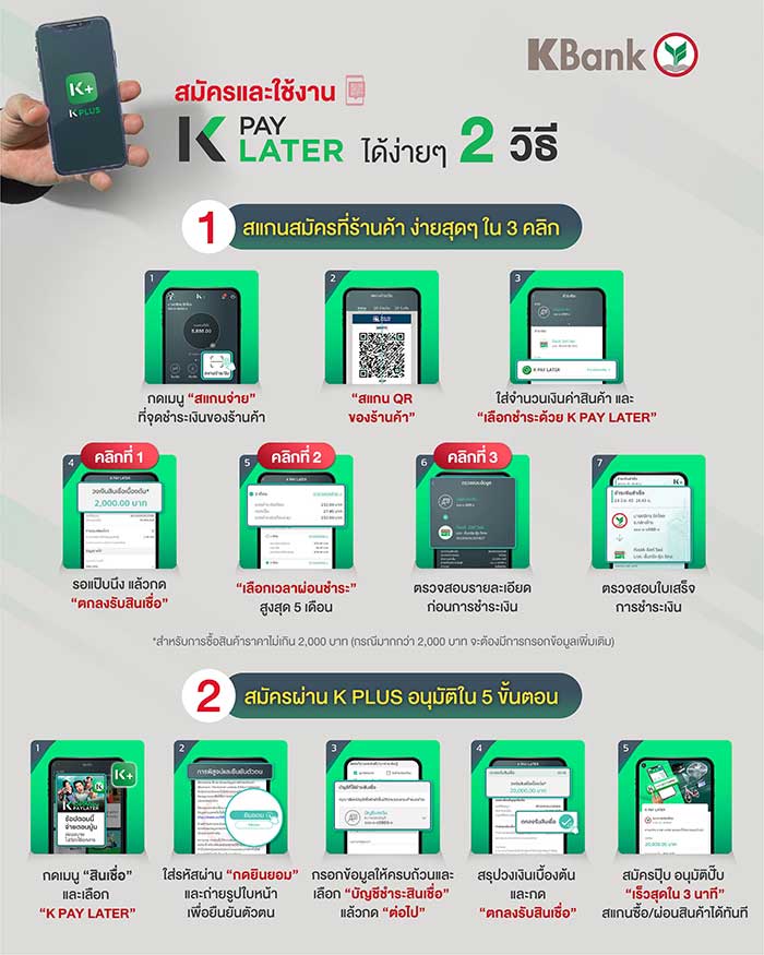 ธนาคารกสิกรไทย เปิดตัวบริการ “K PAY LATER” ภายใต้คอนเซ็ปต์ “ช้อปตอนนี้จ่ายตอนนู้น” ช่วยคนตัวเล็กที่ช็อตให้มีวงเงินสำรองในการซื้อสินค้าและอุปโภคบริโภคเพื่อการดำรงชีวิต และเพิ่มโอกาสให้คนกลุ่มนี้สามารถเข้าถึงสินเชื่อในระบบที่ถูกกฎหมายและเป็นธรรม โดยเฉพาะกลุ่มอาชีพอิสระ ค้าขายรายย่อย หรืออาชีพรับจ้าง ที่ไม่มีเอกสารแสดงรายได้ ก็สมัครได้ง่าย ๆ ด้วยตัวเองผ่าน K PLUS หลังอนุมัติสามารถนำวงเงินไปช้อปได้ทันทีที่ร้านค้ามากกว่าแสนร้านค้าทั่วประเทศ
