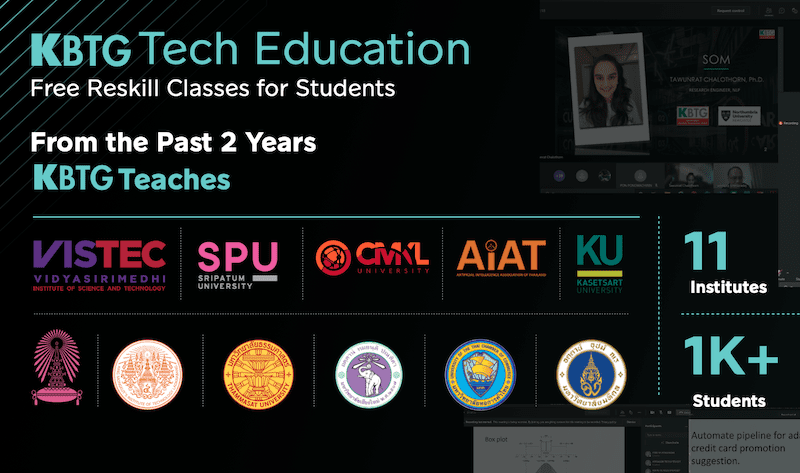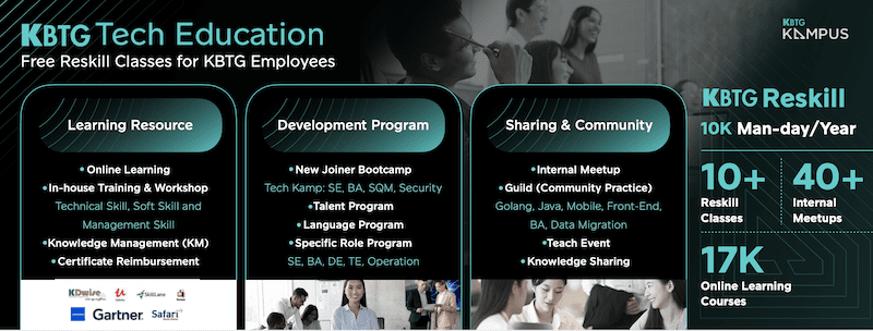 นอกจากงานวิจัย งานด้านการศึกษา KBTG ให้ความสำคัญและทำมาโดยตลอด คือ การ reskill/upskill พนักงาน ทั้ง online learning และ in-house training ด้วยหลักสูตรต่าง ๆ ตั้งแต่เริ่มงานจนร่วมงาน ทั้งด้านภาษา และด้านเทคนิค อาทิ software engineering และ business analyst เป็นต้น รวมเป็น 17,000 คอร์ส