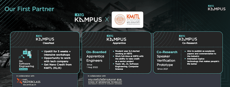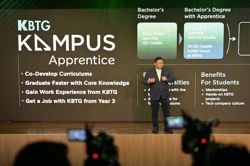 “KBTG Kampus Apprentice คือ อนาคตของการฝึกงาน สมัยก่อนที่ฝึกงานเสร็จแล้วต้องกลับไปเรียนต่อปีที่ 4 แต่ใช้เวลาการเรียนปีที่ 4 มาทำงานจริง รับเงินเดือนจริง รับเครดิตการศึกษา และรับปริญญาได้ และจับมือกับสถาบันเทคโนโลยีพระจอมเกล้าเจ้าคุณทหารลาดกระบัง (สจล.) เป็นที่แรก”