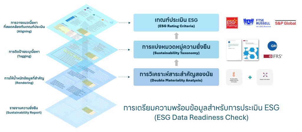 การเตรียมความพร้อมข้อมูล ESG เพื่อการเผยแพร่เป็นข้อมูลสาธารณะที่หน่วยงานผู้ประเมินจะใช้ในการวิเคราะห์ได้อย่างครบถ้วนเพียงพอ จึงมีส่วนสำคัญที่ทำให้ผลประเมินสะท้อนสิ่งที่องค์กรดำเนินการตามความเป็นจริง ไม่เสียโอกาสในลักษณะที่บริษัทมีการดำเนินการอยู่จริง แต่ขาดการจัดทำข้อมูลเผยแพร่ หรือมีการเผยแพร่เพียงบางส่วน เป็นเหตุให้หน่วยงานผู้ประเมินไม่สามารถประเมินเพื่อให้คะแนนได้เต็มที่