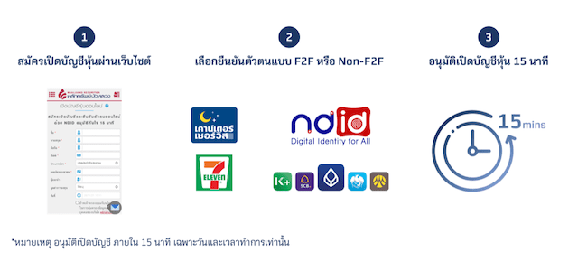 1. Non-Face to Face หรือวิธียืนยันตัวตนรูปแบบดิจิทัล (NDID) โดยนักลงทุนที่เคยยืนยันตัวตนกับสถาบันการเงินหรือธนาคาร และมีการสมัครใช้ NDID ไว้แล้ว ไม่จำเป็นต้องไปแสดงตัวตนซ้ำอีก ทำให้มีความสะดวก และลดขั้นตอนในการยืนยันตัวตนได้ง่าย ๆ เพียงสมัครเปิดบัญชีหุ้นและเลือกยืนยันตัวตน ผ่านแอปพลิเคชันของธนาคารที่คุณใช้งาน ก็เป็นอันจบขั้นตอน เพียงเท่านี้คุณก็จะสามารถได้รับเลขที่บัญชีซื้อขายหุ้นทันที ภายใน 15 นาที เช่นเดียวกัน