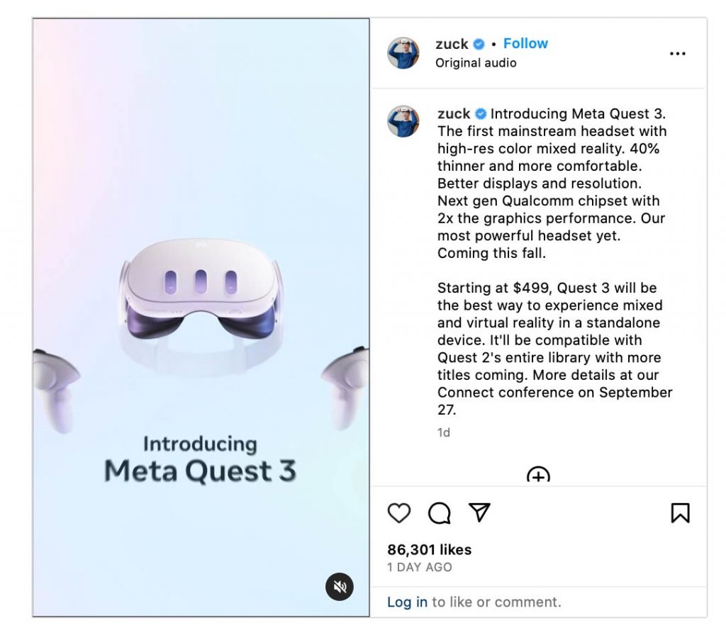 โดย ซักเคอร์เบิร์ก ระบุผ่านคลิปวีดีโอที่โพสต์ลงอินสตาแกรมว่า ชุดอุปกรณ์สวมใส่ VR (Virtual Reality) Quest 3 นี้จะมีสนนราคาเริ่มต้นที่ 499 ดอลลาร์สหรัฐ (ราว 17,290 บาท) ซึ่งมีคุณสมบัติเป็นชุดสวมใส่ VR ชุดแรกที่ผสานโลกของความเป็นจริง ด้วยภาพสีความละเอียดสูง แถมยังมีขนาดที่บาง Quest 2 รุ่นก่อนหน้าถึง 40%