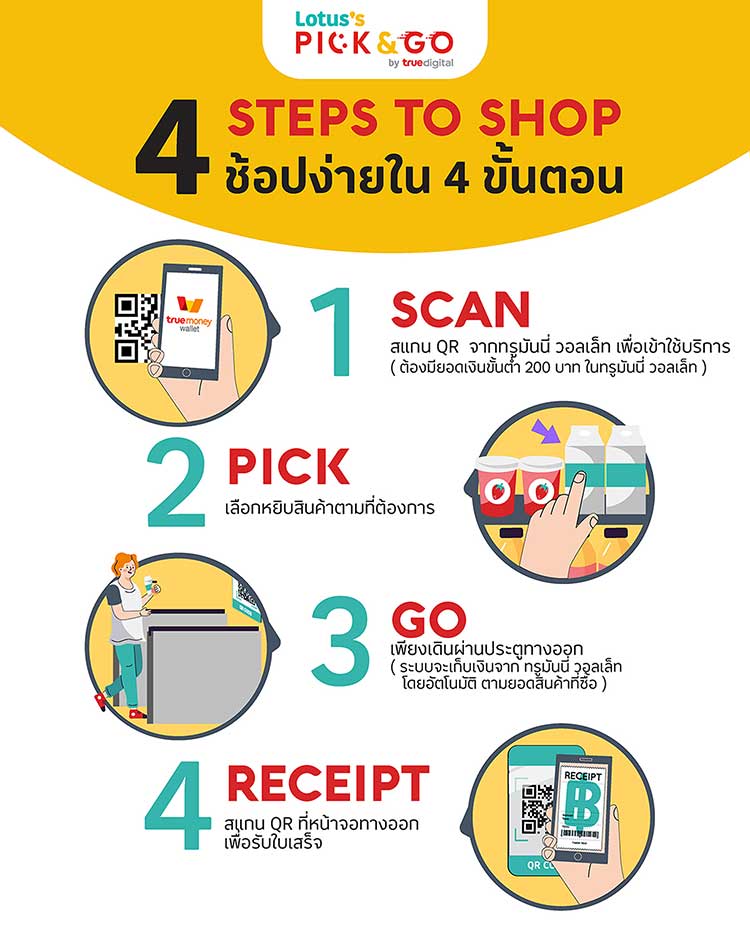 Lotus’s Pick & Go by True Digital ตั้งอยู่อยู่ในโลตัส นอร์ธ ราชพฤกษ์ โซนอัจฉริยะ บนพื้นที่กว่า 30 ตร.ม. คัดสรรสินค้ากว่า 400 รายการ กว่า 90% เป็นสินค้าประเภทเครื่องดื่มและขนมขบเคี้ยว และ 10% เป็นสินค้าทั่วไปในชีวิตประจำวัน เช่น ผ้าอนามัย กระดาษทิชชู่ สำหรับลูกค้าที่มีความจำเป็นซื้อสินค้าแบบเร่งด่วนโดยไม่ต้องเข้าไปใช้บริการในไฮเปอร์มาร์เก็ต จากการทดลองการใช้บริการของลูกค้าตั้งแต่สแกนเข้าร้านจนเดินออกจากร้าน สามารถซื้อสินค้าและชำระเงินอัตโนมัติผ่าน TrueMoney Wallet ได้ในเวลาเพียงไม่กี่นาทีเท่านั้น ถือเป็นการเปิดประสบการณ์การช้อปปิ้งที่เร็ว สะดวก และอัจฉริยะ