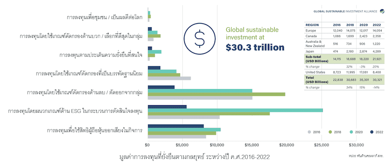 เมื่อวันพฤหัส (29 พ.ย.) ที่ผ่านมา Global Sustainable Investment Alliance (GSIA) ได้ทำการเผยแพร่รายงาน 2022 Global Sustainable Investment Review ที่จัดทำขึ้นทุกสองปี โดยจากงานสำรวจชิ้นล่าสุด พบว่า ในปี พ.ศ.2565 ตัวเลขการลงทุนที่ยั่งยืนทั่วโลก มีมูลค่าอยู่ที่ 30.3 ล้านล้านเหรียญ ลดลงจากตัวเลข 35.3 ล้านล้านเหรียญ ในปี พ.ศ.2563 หรือลดลงร้อยละ 14.1 ในช่วงเวลาสองปี