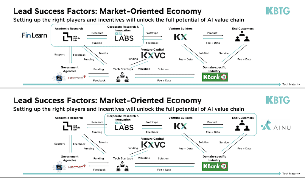 สิ่งสำคัญที่สุดก็คือการสร้างระบบนิเวศ การสร้างให้เกิดความร่วมมือกันระหว่างผู้มีส่วนได้ส่วนเสียทั้งหมดในระบบนิเวศร่วมกัน ตั้งแต่ผู้ให้นโยบาย สถานศึกษา นักวิจัย ซึ่ง KBTG มีศูนย์วิจัยขององค์กรที่ทำงานร่วมกับนักวิจัยของภาครัฐและสถานศึกษาอย่างใกล้ชิด