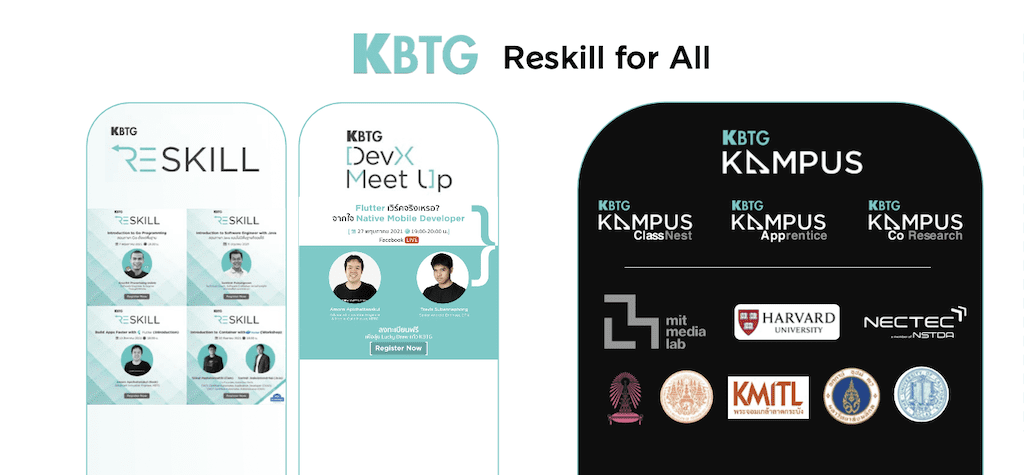 เมื่อเกิดเทคโนโลยีอุบัติใหม่ องค์กรจะต้องมีความสามารถในการ reskill ต้องทำให้คนสามารถเรียนรู้สิ่งใหม่ ๆ ที่เข้ามาได้ ซึ่ง KBTG มีการร่วมมือกับสถานศึกษาและสถาบันวิจัยทั้งในประเทศและระหว่างประเทศรวมมากกว่า 20 แห่ง และมีการจ้างงาน AI talent หลายสิบคน และมีการเข้าไปช่วยออกแบบหลักสูตรโดยทำงานกันอย่างใกล้ชิดกับสถานศึกษา