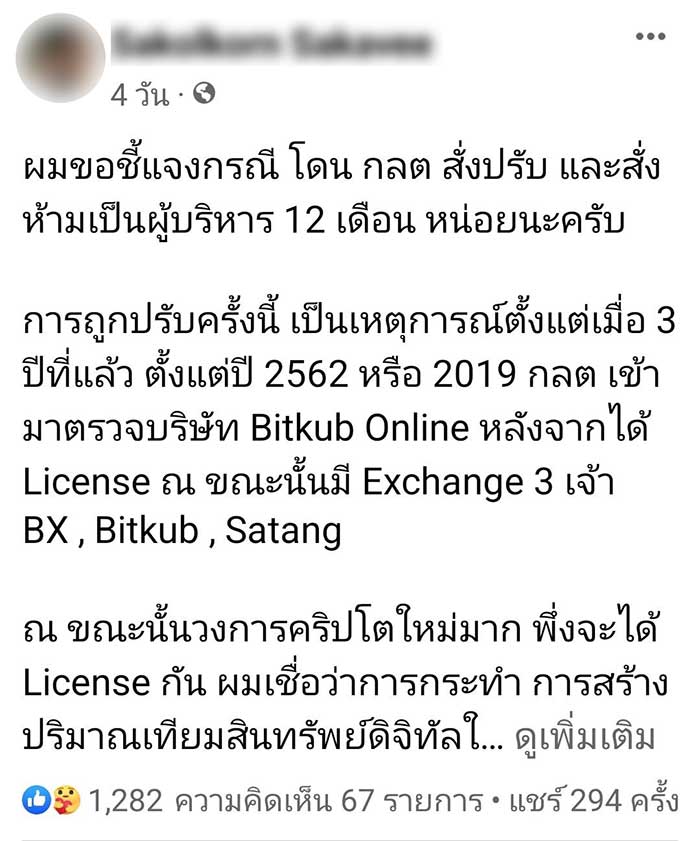 “ผมขอชี้แจงกรณี โดน ก.ล.ต. สั่งปรับ และสั่งห้ามเป็นผู้บริหาร 12 เดือน หน่อยนะครับ การถูกปรับครั้งนี้ เป็นเหตุการณ์ตั้งแต่เมื่อ 3 ปีที่แล้ว ตั้งแต่ปี 2562 หรือ 2019 กลต เข้ามาตรวจบริษัท Bitkub Online หลังจากได้ License ณ ขณะนั้นมี Exchange 3 เจ้า BX, Bitkub, Satang ณ ขณะนั้นวงการคริปโตใหม่มาก พึ่งจะได้ License กัน ผมเชื่อว่าการกระทำ การสร้างปริมาณเทียมสินทรัพย์ดิจิทัลในศูนย์ซื้อขายสินทรัพย์ เป็นสิ่งที่ Exchange ทั่วโลก ณ เวลานั้น มีระบบพวกนี้เกือบหมด จึงทำให้มีความผิดพลาด และความไม่เข้าใจกฏเกณอย่างถี่ถ้วน จากทั้ง Bitkub และ Satang (ไม่ขอพาดพิง BX เพราะปิดไปแล้ว)