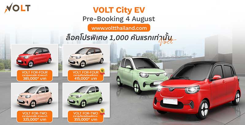 หลังจากที่บริษัทฯ ได้นำเสนอข้อมูล Volt City EV ผ่านเพจเฟสบุ๊ค @VoltCityEV และเว็บไซต์ voltthailand.com ตั้งแต่ต้นเดือนกรกฎาคมที่ผ่านมา ปรากฏว่าได้รับกระแสตอบรับเป็นอย่างดี ทางบริษัทฯ จึงตอบกระแสด้วยการได้เปิดรับจองผ่านระบบออนไลน์ โดยเริ่มเปิดให้เข้าจองได้ตั้งแต่วันนี้ (4 สิงหาคม) เวลา 14:59 น. เป็นต้นไป โดยจำกัดการรับจองที่ 1,000 คัน สำหรับ 2 รุ่นแรก คือ VOLT FOR-TWO (3 ประตู 2 ที่นั่ง) ราคา 325,000 บาท และ VOLT FOR-FOUR (5 ประตู 4 ที่นั่ง) ราคา 385,000 บาท