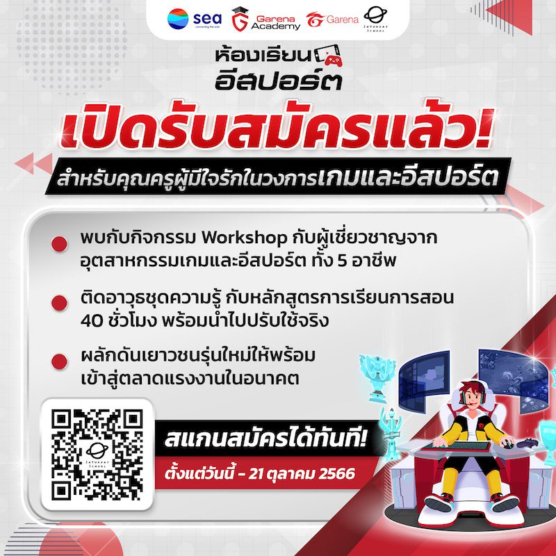 “การีนา” เปิดตัวหลักสูตร “ห้องเรียนอีสปอร์ต” แบบพร้อมสอน เปิดรับสมัครคุณครูร่วมเวิร์กช้อปแล้ว วันนี้ – 21 ต.ค. 2566