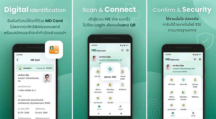 ศ.เกียรติคุณ พญ.สมศรี เผ่าสวัสดิ์ นายกแพทยสภา กล่าวว่า แพทยสภาเล็งเห็นถึงความสำคัญของการเพิ่มประสิทธิภาพในการบริหารจัดการ และยกระดับการให้บริการด้านสาธารณสุขให้ทันสมัย มีคุณภาพตามมาตรฐานสากล และตอบโจทย์การใช้ชีวิตวิถีใหม่ตามนโยบาย Thailand 4.0 โดยในครั้งนี้ ได้รับความร่วมมือจากธนาคารกรุงไทย นำเทคโนโลยีดิจิทัลมาเชื่อมโยงข้อมูลสมาชิกของแพทยสภาในระบบ MD eService และพัฒนาขึ้นมาเป็น แอปพลิเคชัน MD eConnect ที่สามารถใช้งานผ่านโทรศัพท์มือถือ ได้ทุกที่ทุกเวลา 24 ชั่วโมง เพื่ออำนวยความสะดวกด้านการให้บริการกับสมาชิกแพทยสภาซึ่งปัจจุบันมีแพทย์จำนวนประมาณ 70,000 คน และนักศึกษาแพทย์จำนวนประมาณ 16,800 คนทั่วประเทศ โดยคำนึงถึงความปลอดภัยของข้อมูลตามพระราชบัญญัติคุ้มครองข้อมูลส่วนบุคคล พ.ศ.2562 (PDPA) เป็นสำคัญ และรักษาความปลอดภัยของข้อมูลด้วยเทคโนโลยี Self-Sovereign Identity (SSI) ที่ได้รับการรับรองตามมาตรฐานสากล