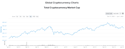 สำหรับมูลค่าตลาดคริปโทเคอร์เรนซีในปี 2021 ที่รวบรวมทุกสกุลในโลก พบว่าในช่วงต้นปี คริปโทฯ มีมูลค่าตลาดรวมที่ 760,813,374,590 ดอลลาร์ หรือประมาณ 25 ล้านล้านบาท ทำระดับสูงสุดที่ 2,971,638,073,102 ดอลลาร์ หรือประมาณ 98 ล้านล้านบาท เมื่อวันที่ 10 พฤศจิกายน 2021 จากนั้นจึงย่อลงมาระดับหนึ่ง และส่งท้ายปีที่ 2,233,586,799,113 ดอลลาร์ หรือประมาณ 74 ล้านล้านบาท