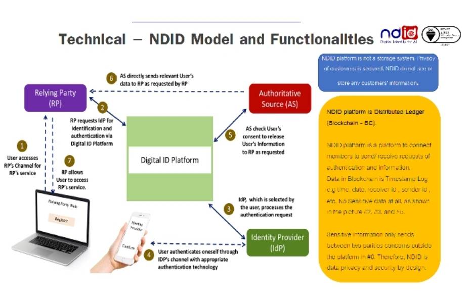 ทั้งนี้ การดำเนินการพิสูจน์ตัวตน เป็นการเชื่อมต่อระหว่างสมาชิกด้วยกัน ระบบไม่ได้เกี่ยวข้องกับข้อมูลส่วนบุคคลใด ๆ ทั้งสิ้น ระบบ NDID เป็นเพียงการเชื่อมโยงระหว่าง ผู้ที่ต้องพิสูจน์ยืนยันตัวตน หรือ RP – Relining Party กับ ผู้ที่ให้บริการพิสูจน์ยืนยันตัวตน คือ IDP – Identity Provider ซึ่งบริษัทที่จะให้บริการนี้ได้ ต้องผ่านการตรวจสอบอย่างค่อนข้างเข้มข้น เช่น ธนาคาร เป็นต้น