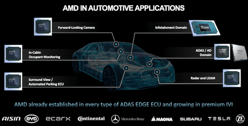 AMD ประกาศเดินหน้าเทคโนโลยีสำหรับวงการยานยนต์ เปิดตัว 2 ผลิตภัณฑ์ใหม่ ก่อนงาน CES 2024 และเตรียมโชว์เทคโนโลยีสุดล้ำร่วมกับพาร์ทเนอร์มากมาย การเปิดตัวนี้ตอกย้ำถึงความสำเร็จของการควบรวมกิจการ Xilinx เมื่อ 2 ปีก่อน ทำให้ AMD ขยายพอร์ตผลิตภัณฑ์สำหรับตลาดยานยนต์อย่างก้าวกระโดด ครอบคลุมทุกด้านตั้งแต่ระบบข้อมูลความบันเทิงในรถ ไปจนถึงเทคโนโลยีขับขี่อัตโนมัติและปัญญาประดิษฐ์สำหรับการตรวจจับวัตถุ การจอดรถอัตโนมัติ และอื่น ๆ อีกมากมาย