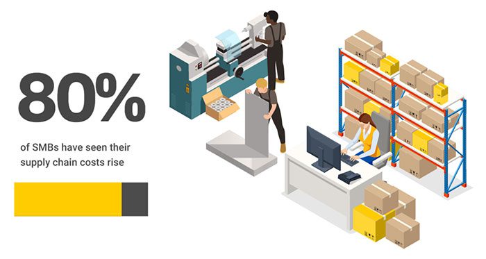 สงครามในยูเครน ราคาน้ำมันพุ่งสูงขึ้น ภาวะเงินเฟ้อทั่วโลก และนโยบายจำกัดการเดินทางเข้า-ออกของประเทศจีนเนื่องจากสถานการณ์โควิด ส่งผลให้สินค้าส่งออกจากประเทศจีนเกิดความล่าช้า จึงไม่น่าแปลกใจที่ 67% ของธุรกิจเอสเอ็มอีในสหรัฐฯ ต้องเผชิญกับปัญหาท้าทายด้านสินค้าคงคลังในปี 2565 และ 80% พบว่าต้นทุนด้านซัพพลายเชนของพวกเขาเพิ่มสูงขึ้น[4] ขณะที่ช่วงเวลาธุรกิจอีคอมเมิร์ซที่มีความคึกคักมากที่สุดกำลังจะมาถึง ความกดดันก็อาจจะมีเพิ่มขึ้นเช่นกัน