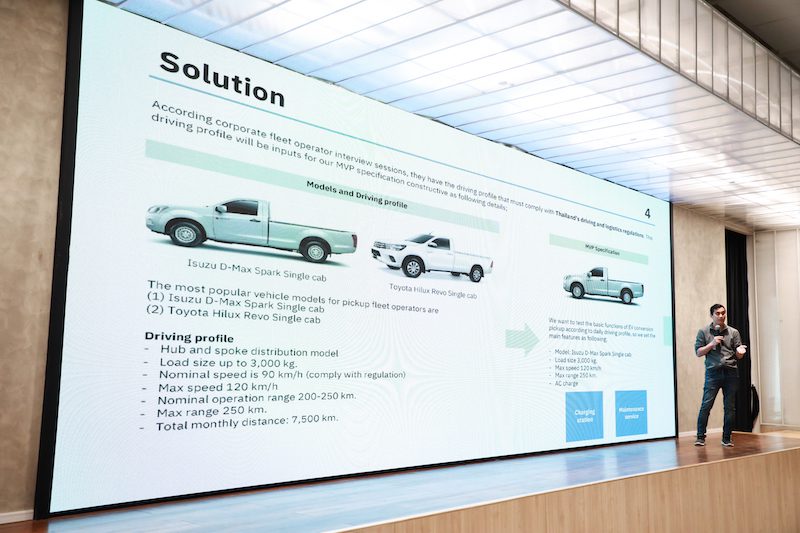 Project EV คือ สตาร์ทอัพที่มีแนวคิดและรูปแบบธุรกิจที่ตอบโจทย์ความต้องการของอุตสาหกรรมในปัจจุบัน รวมถึงตอบโจทย์พันธกิจ Net Zero ขององค์กรธุรกิจ ด้วยบริการการดัดแปลงรถกระบะสันดาปเป็นรถอีวีสำหรับ Fleet เชิงพาณิชย์ และเป็น 1 ใน 8 ทีมสุดท้ายที่ผ่านเข้ารอบการนำเสนอแนวคิดและแผนธุรกิจต่อคณะกรรมการตัดสินในวันที่ 22 พฤศจิกายนที่ผ่านมา