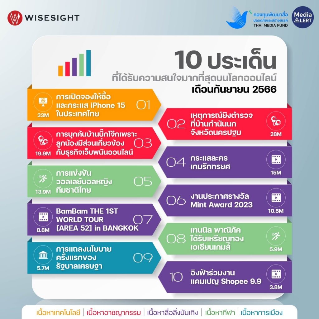 Media Alert กองทุนพัฒนาสื่อปลอดภัยและสร้างสรรค์ ร่วมกับ Wisesight ศึกษาการสื่อสารออนไลน์ของสังคมไทยในเดือนกันยายน 2566 โดยใช้เครื่องมือ ZocialEye สำรวจจาก 5 แพลตฟอร์ม ได้แก่ 1) Facebook 2) X 3) Instagram 4) YouTube และ 5) TikTok พบ10 อันดับประเด็นที่ได้รับ Engagement มากที่สุดได้แก่
