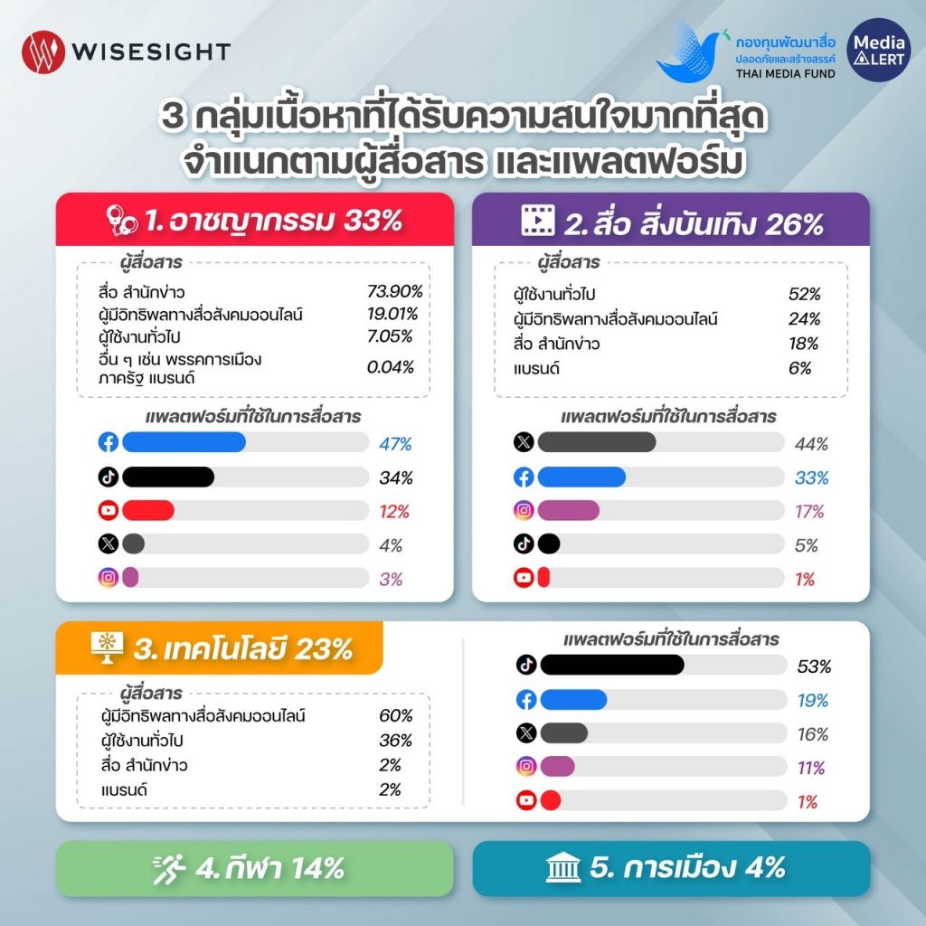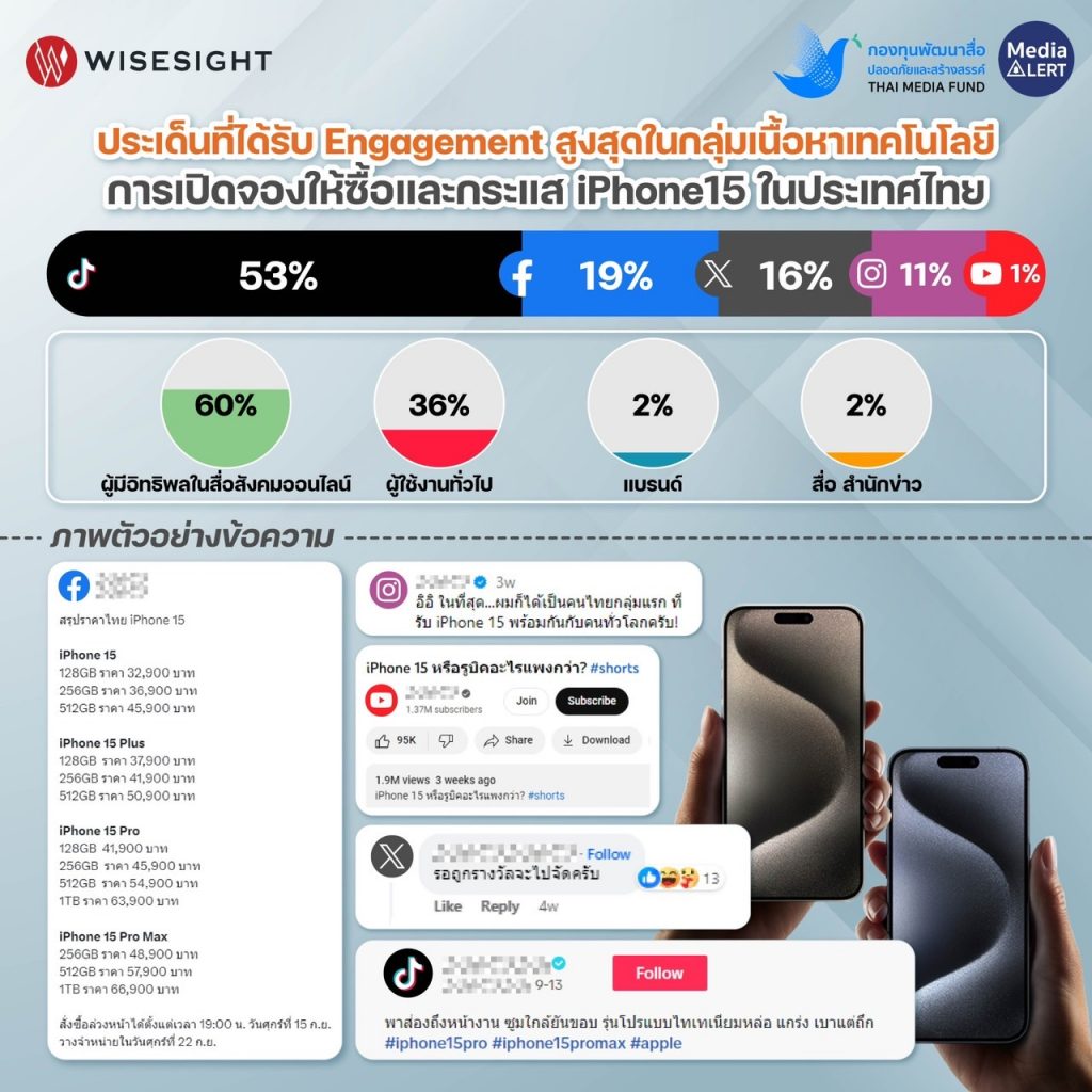สอดคล้องกับผลการศึกษาของ Media Alert และ Wisesight ที่พบว่า ในกลุ่มเนื้อหาเทคโนโลยี กลุ่มผู้สื่อสารที่สามารถสร้างการมีส่วนร่วมมากที่สุด คือ ผู้มีอิทธิพลทางสื่อสังคมออนไลน์ รองลงมาได้แก่ ผู้ใช้งานทั่วไป ตามด้วย สื่อและสำนักข่าว โดยมี TikTok เป็นแพลตฟอร์มที่สร้าง Engagement มากที่สุด ที่ 53% รองลงมาได้แก่ Facebook 19% ตามด้วย X 16% และ Instagram 11%