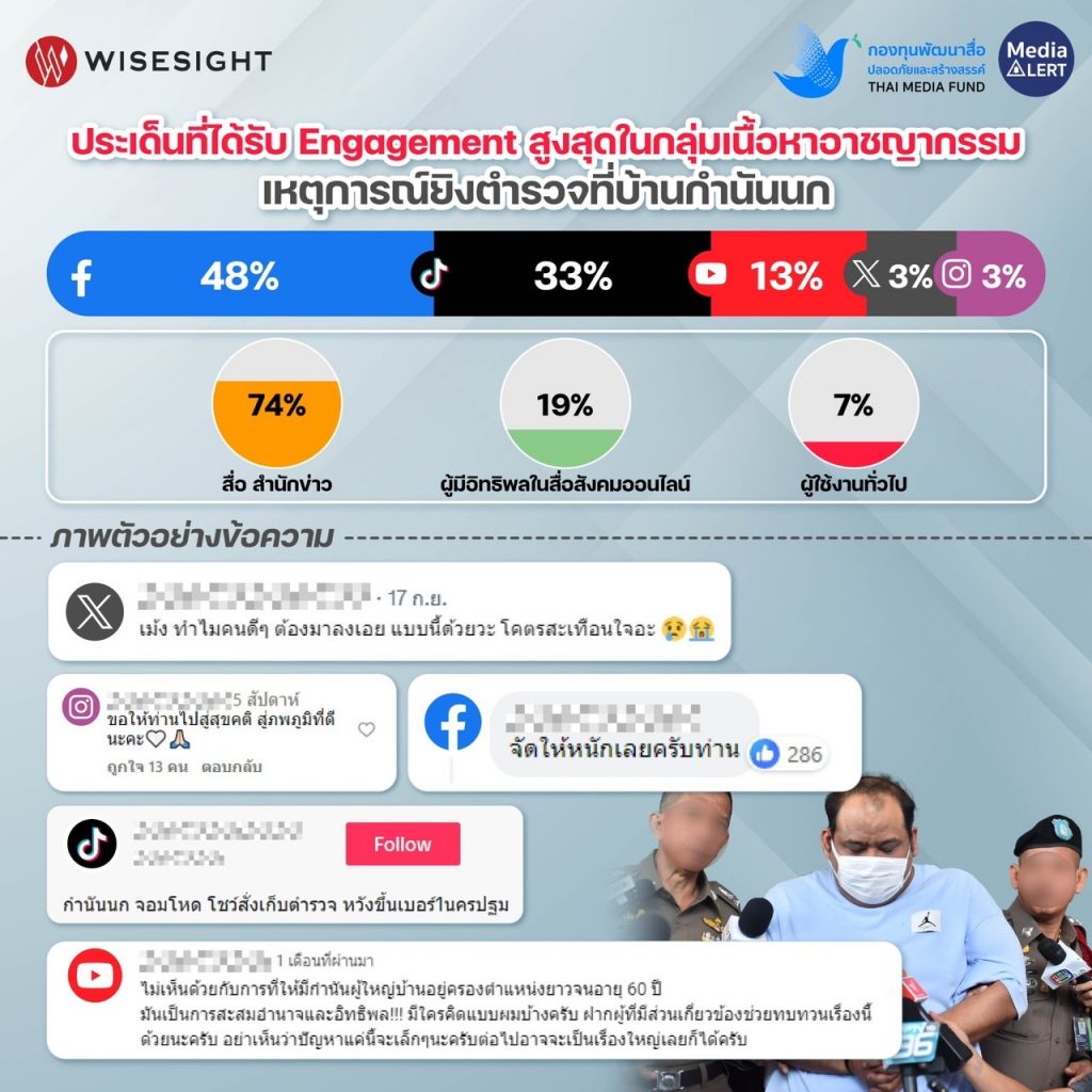 ซึ่งสอดคล้องกับผลการศึกษาของ Media Alert และ Wisesight ที่พบว่ากลุ่มเนื้อหาอาชญากรรมที่ได้รับ engagement มากที่สุด คือ เหตุการณ์ยิงตำรวจที่บ้านกำนันนก และการบุกค้นบ้านบิ๊กโจ๊กหรือ พล.ต.อ. สุรเชษฐ์ หักพาล รองผู้บัญชาการตำรวจแห่งชาติ ซึ่งเนื้อหากลุ่มนี้ สื่อและสำนักข่าวคือกลุ่มผู้สื่อสารที่มีอิทธิพลหรือสามารถสร้างการมีส่วนร่วม (Engagement) รองลงมาได้แก่ผู้มีอิทธิพลทางสื่อสังคมออนไลน์ ตามด้วยผู้ใช้งานทั่วไป โดย Facebook เป็นช่องทางที่มี Engagement มากที่สุด รองลงมาเป็น TikTok และ YouTube