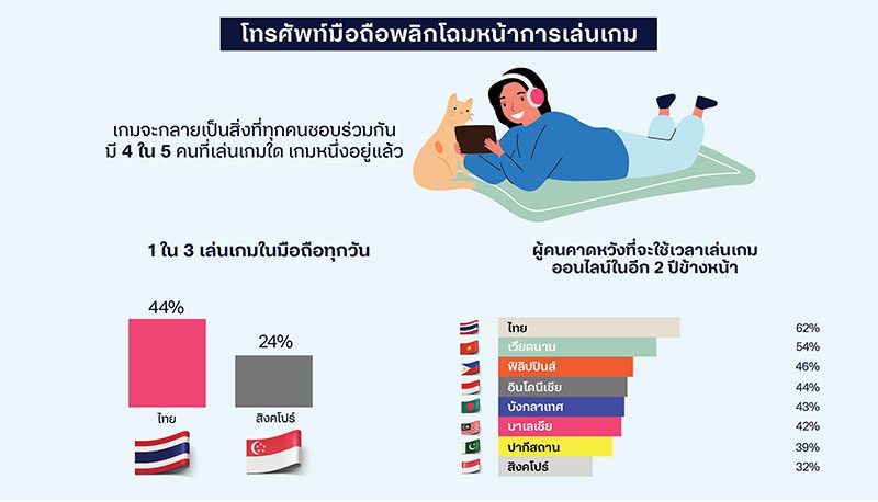 ผู้ตอบแบบสอบถามจำนวน 4 ใน 5 คนเล่นเกมบนโทรศัพท์มือถือ โดยเกือบ 1 ใน 3 (31%) นั้นเล่นเกมทุกวัน นำโดยผู้ตอบแบบสอบถามในประเทศไทย (44%) และเวียดนาม (41%) การวิจัยชี้ให้เห็นว่านิยามของเกมเมอร์จำเป็นต้องได้รับการปรับปรุงใหม่ เนื่องจากการเล่นเกมปัจจุบันสามารถเข้าถึงคนทุกเพศทุกวัย การเปลี่ยนแปลงดังกล่าวชี้ให้เห็นถึงบทบาทเชิงบวกของโทรศัพท์เคลื่อนที่ในการส่งเสริมให้ผู้คนสามารถเข้าถึงการเล่นเกมได้ง่ายกว่าที่เคยเป็นมา