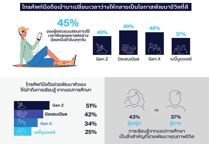 ผู้บริโภคในภูมิภาคเอเชียต้องการเรียนรู้ในช่วงเวลาทำงานและพัฒนาตัวเองในยามว่าง โดย 45% ของผู้ตอบแบบสอบถามใช้เวลาอย่างน้อยหนึ่งชั่วโมงต่อวันในการฟังพอดคาสต์ โดยผู้ตอบแบบสอบถามในประเทศไทย (66%) และปากีสถาน (65%) มีแนวโน้มที่จะฟังพอดคาสต์มากที่สุด ขณะที่ชาวสิงคโปร์รู้สึกว่าตนได้รับประโยชน์จากการใช้แอปประเภทดังกล่าวน้อยที่สุด โดยมีเพียง 20% เท่านั้นที่รู้สึกว่าแอปพลิเคชันเหล่านี้ช่วยยกระดับคุณภาพชีวิตอย่างมีนัยสำคัญ เทียบกับค่าเฉลี่ยที่ 40%