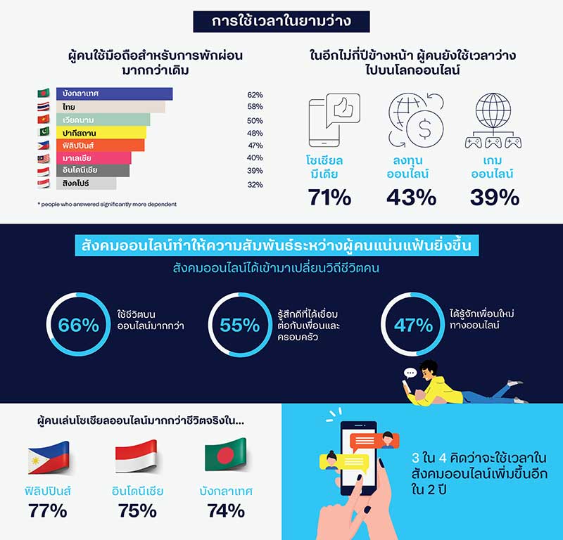 การแพร่ระบาดของโควิด-19 ทำให้คนไทยใช้เวลาในสังคมออนไลน์เพิ่มขึ้นก้าวกระโดด โดย 66% พบปะผู้คนใหม่ ๆ ทางออนไลน์เป็นประจำ (เทียบกับค่าเฉลี่ยที่ 47%) ในขณะที่ 63% กล่าวว่าโทรศัพท์มือถือช่วยให้ตนสามารถติดต่อกับผู้คนที่รู้จักมากขึ้น (ค่าเฉลี่ย 55%)
