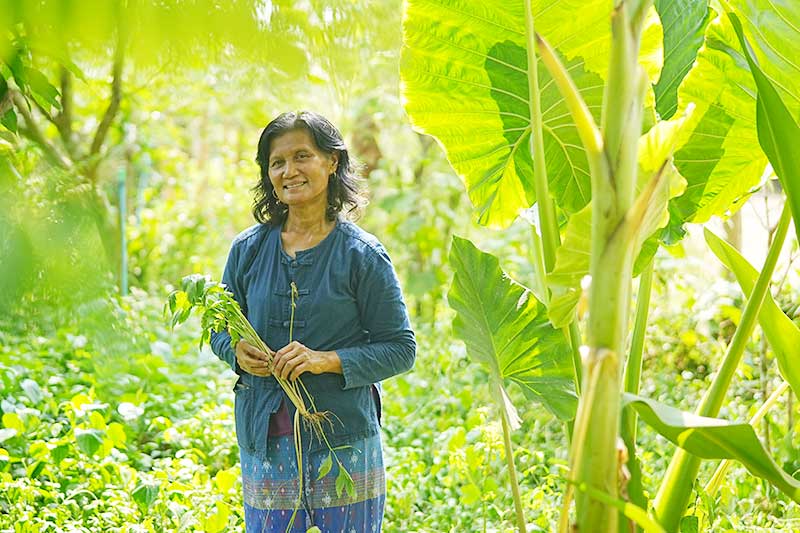 “อาชีพหลักดั้งเดิมของเราตั้งแต่ปู่ย่าตายาย คือ การทำนา และเริ่มทำสวนเกษตรอินทรีย์ได้ประมาณ 9 ปี เริ่มจากเล็ก ๆ น้อย ๆ รายได้เดือนละ 2-3 ร้อย ก็เพิ่มขึ้นมาเรื่อย ๆ โดยเน้นปลูกพืชผักอายุยืนยาว เช่น ผักแต้ว ชะมวง พริก มะเขือ กล้วย มะละกอ ส้มโอ ทุเรียน มีผักกูดและจิงจูฉ่าย เป็นซิกเนเจอร์ เมื่อเรามีน้ำ ก็สามารถบำรุงรักษาเก็บขายได้ตลอดทั้งปี”