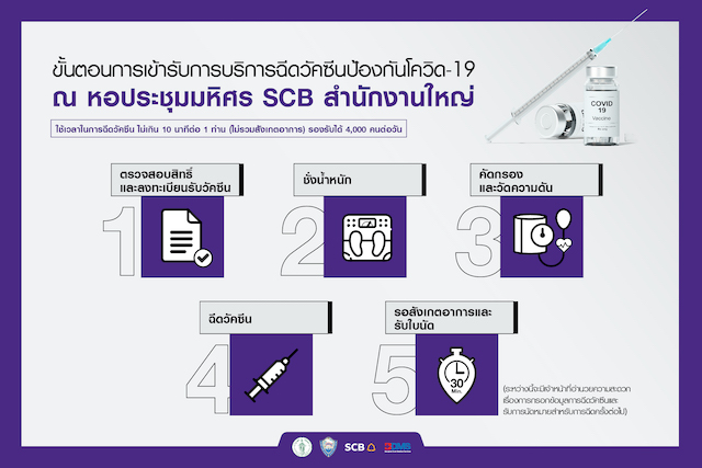 ธนาคารไทยพาณิชย์ ร่วมประกาศความพร้อมในการให้บริการฉีดวัคซีนโควิด-19 แก่ประชาชน ณ หอประชุมมหิศร ธนาคารไทยพาณิชย์ สำนักงานใหญ่ ซึ่งเป็นหน่วยบริการฉีดวัคซีนโควิด-19 นอกสถานพยาบาลในเขตกรุงเทพมหานคร ที่มีความพร้อมให้บริการฉีดวัคซีนอย่างรวดเร็วภายใน 5-7 นาทีต่อ 1คน (ไม่รวมสังเกตอาการ 30 นาที)