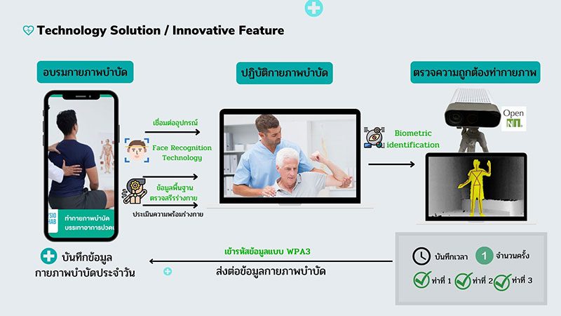 นวัตกรรมของเรา ได้นำเทคโนโลยี Face Recognition มาประยุกต์ใช้เพื่อประกอบการบันทึกข้อมูล Biometric เพื่อเป็นการจำแนกรูปแบบทางกายภาพ ตลอดจนประเมินความปลอดภัยของผู้ป่วย จากนั้นจะเข้าสู่กระบวนการอบรมในภาคทฤษฎีผ่านระบบออนไลน์และทำแบบทดสอบให้ครบตามจำนวนชั่วโมงที่กำหนด จากนั้นให้ทำการเชื่อมต่ออุปกรณ์กล้อง Kinect หันหน้าไปทางผู้ป่วย ระบบ Biometric Identification จะเริ่มทำงานเพื่อการยืนยันอัตลักษณ์ผู้ป่วย และเริ่มต้นเก็บข้อมูลการกายภาพบำบัด จากนั้นจึงเริ่มทำกายภาพตามท่าที่หลักสูตรกำหนด