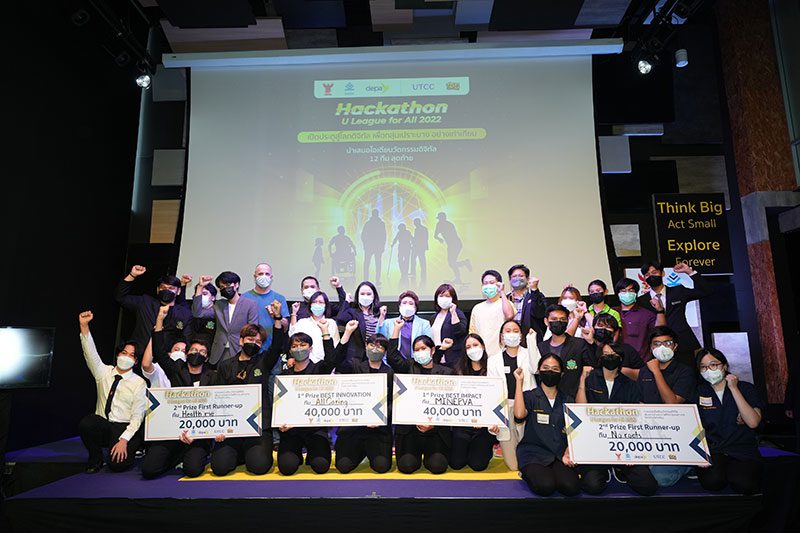 สำนักงานส่งเสริมเศรษฐกิจดิจิทัล (depa) ร่วมกับ ศูนย์การสร้างผู้ประกอบการที่ขับเคลื่อนด้วยนวัตกรรม มหาวิทยาลัยหอการค้าไทย (IDE Center) จัดงานประกาศผลรางวัล โครงการ“Hackathon U League for All 2022” โดยทีม “Minerva”คว้ารางวัลชนะเลิศสาขา Best Impact ด้วยแนวคิด ที่ช่วยยกระดับคุณภาพการทำงานให้กับกลุ่มผู้ประกอบอาชีพขับรถซาเล้ง เพื่อลดความเหลื่อมล้ำ สนับสนุนความยั่งยืนด้านสิ่งแวดล้อมและเศรษฐกิจระดับฐานราก และ ทีม “All Caring” รับรางวัลในสาขา Best Innovation จากที่สุดแห่งไอเดียนวัตกรรมทางเทคโนโลยีเพื่อส่งเสริมความรู้และสมรรถนะการฟื้นฟูสุขภาพกายของกลุ่มผู้สูงอายุ และผู้ป่วยติดเตียง ด้วยแนวทางที่เหมาะสมต่อผู้ป่วยแบบเฉพาะโรคและเฉพาะบุคคล