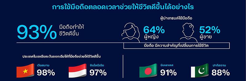 ผู้ตอบแบบสำรวจ 93% เชื่อว่าการใช้งานโทรศัพท์มือถือช่วยให้มีคุณภาพชีวิตที่ดีขึ้น โดยรวมแล้ว ผู้หญิงเป็นผู้นำเทรนด์นี้ โดย 63% กล่าวว่าคุณภาพชีวิตดีขึ้นอย่างมากเมื่อเทียบกับผู้ใช้งานเพศชายที่ 52% แนวโน้มนี้ชัดเจนที่สุดในประเทศไทย (75%) และอินโดนีเซีย (71%) ซึ่งมีจำนวนผู้ใช้งานเพศหญิงที่เชื่อมต่อกับ “ชีวิตที่ดีขึ้นอย่างมีนัยสำคัญ” ผ่านโทรศัพท์มือถือเป็นจำนวนสูงที่สุด