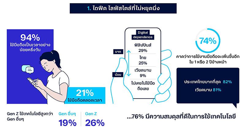 ผู้ตอบแบบสำรวจเกือบทั้งหมด พกโทรศัพท์มือถือติดตัวเป็นเวลาอย่างน้อยครึ่งวัน และ 1 ใน 5 พกโทรศัพท์ติดตัวตลอดเวลา อย่างไรก็ตาม ผู้ตอบแบบสำรวจส่วนใหญ่รู้สึกว่าตนเองสามารถใช้เทคโนโลยีได้อย่างสมดุล (76%) ผู้คนในฟิลิปปินส์และไทยมีชีวิตที่พึ่งพาอยู่กับโทรศัพท์มือถือมากที่สุด โดย 29% และ 26% ตามลำดับกล่าวว่าพวกเขาพกโทรศัพท์มือถือติดตัวตลอดเวลา