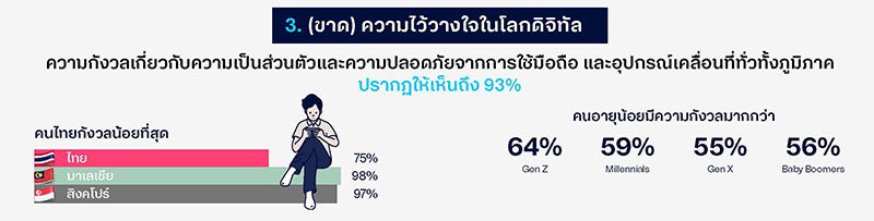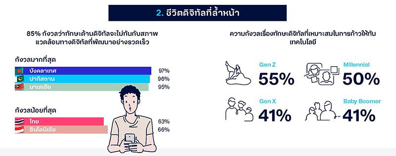 - คนไทยยังแสดงความมั่นใจสูงสุดเมื่อเทียบกับผู้ตอบแบบสำรวจในประเทศอื่นๆ ว่าจะสามารถก้าวทันการเปลี่ยนแปลงทางเทคโนโลยีในอนาคต โดยมีเพียง 63% ที่มีความกังวลในด้านนี้ เมื่อเทียบกับค่าเฉลี่ยที่ 85%