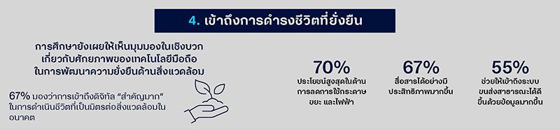 3 ใน 4 ของผู้ตอบแบบสำรวจเชื่อว่าการเข้าถึงดิจิทัลนั้น “สำคัญมาก” สำหรับพวกเขาในการดำเนินชีวิตที่เป็นมิตรต่อสิ่งแวดล้อมในอนาคต อย่างไรก็ตาม ตัวเลขของในประเทศไทยนั้นอยู่ในระดับต่ำที่สุด (63%) มาเลเซีย (57%) และสิงคโปร์ (41%)