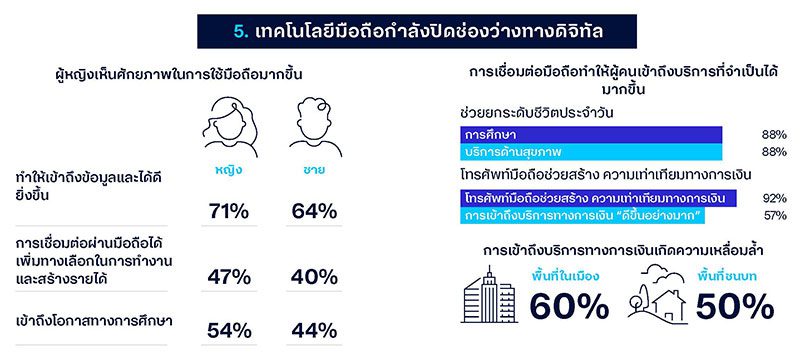ผู้ตอบแบบสอบถามยังตระหนักด้วยว่า การเชื่อมต่อมือถือเป็นตัวช่วยสร้างความเท่าเทียม ทำให้ผู้คนสามารถเข้าถึงบริการที่จำเป็นได้มากขึ้น ซึ่งช่วยยกระดับชีวิตประจำวันของพวกเขา เช่น การศึกษา (88%) และบริการด้านสุขภาพ (88%)
