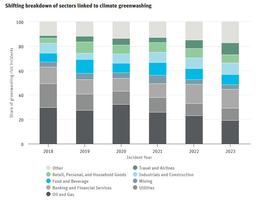 ทั้งนี้ เป็นการฟอกเขียวด้านสภาพภูมิอากาศที่อยู่ในกลุ่มธุรกิจสาธารณูปโภค จำนวน 71 กรณี (10%) กลุ่มธุรกิจอาหารและเครื่องดื่ม จำนวน 62 กรณี (9%) กลุ่มวัสดุอุตสาหกรรมและก่อสร้าง จำนวน 60 กรณี (9%) กลุ่มธุรกิจค้าปลีก ของใช้ในครัวเรือนและของใช้ส่วนตัว จำนวน 55 กรณี (8%) กลุ่มธุรกิจสายการบินและการเดินทางท่องเที่ยว จำนวน 47 กรณี (7%) และกลุ่มธุรกิจเหมืองแร่ จำนวน 27 กรณี (4%) นอกนั้นอยู่ในกลุ่มธุรกิจอื่น ๆ อีกจำนวน 104 กรณี (15%)
