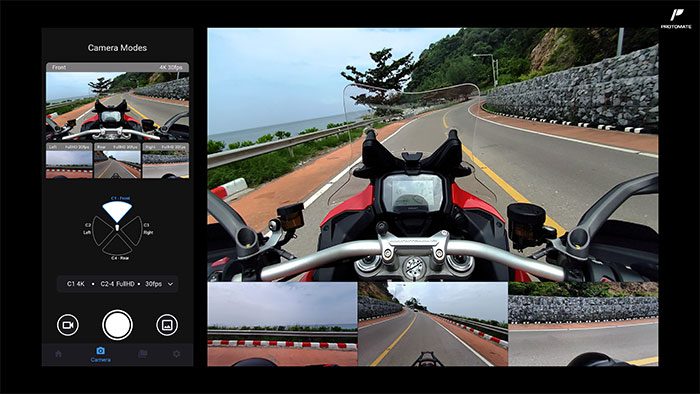 การลงรายละเอียดพร้อมจัดเต็มในแต่ละเทคโนโลยีทั้งฮาร์ดแวร์และซอฟต์แวร์ โดยมี “ประสบการณ์ของผู้ใช้นำทาง” จึงเริ่มจากกล้องบันทึกภาพและวิดีโอ 4 ตัวเป็นแบรนด์แรกของโลก Built-In มาให้ ณ ตำแหน่ง หน้า-หลัง-ซ้าย-ขวา สามารถบันทึกภาพได้พร้อมกันรอบทิศทาง เลือกการบันทึกภาพได้อีกตั้ง 6 โหมด เช่น โหมดที่อัดความละเอียดสูงระดับ 4K กล้องหน้า และ Full HD อีกสามกล้องหลังซ้ายขวาพร้อม ๆ กัน ให้ความคมชัดของภาพ สีสวย แบตเตอรี่โซลิดสเตต (Solid-state Battery) ที่ใช้กับอุตสาหกรรมการบินหรือรถอีวี ทนต่อแรงกระแทกสูง ๆ สามารถจ่ายไฟเมื่อบันทึกภาพที่ความละเอียดสูงสุดได้นานราว 1 ชั่วโมงครึ่งถึง 4 ชั่วโมงขึ้นอยู่กับความละเอียดของวิดีโอที่จะบันทึก สามารถถอดเปลี่ยนแบตเตอรี่ได้ รองรับไมโครเอสดีการ์ด