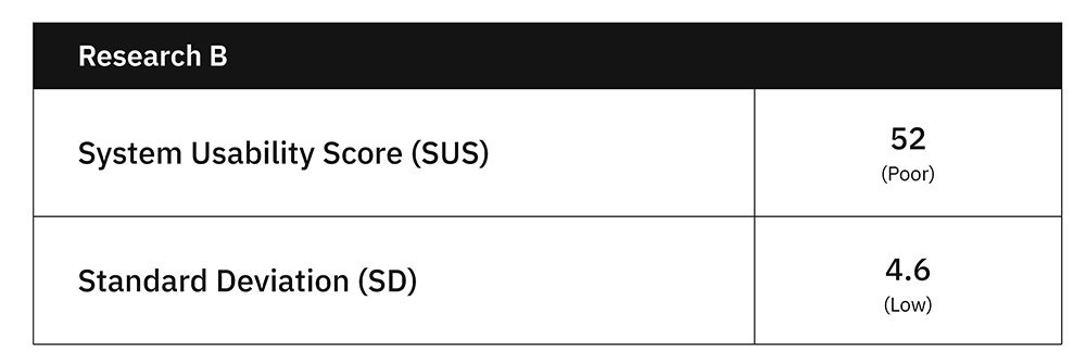 จากผลลัพธ์ข้อมูลที่ได้รับแสดงให้เห็นว่าระบบมีค่าความยากง่ายในการใช้งานที่ต่ำกว่าเกณฑ์มาตรฐาน โดยที่ยังไม่ควรดำเนินพัฒนาระบบต่อไป แต่ควรศึกษาวิจัยด้านการใช้งานเพิ่มมากขึ้นเพื่อพัฒนาการออกแบบ และนำมาวิจัยด้าน Usability Test ใหม่อีกครั้งหลังจากออกแบบใหม่เสร็จ ทั้งนี้ผลลัพธ์จากการวิจัยแสดงถึงค่าเบี่ยงเบนมาตรฐานอยู่ที่ 4.2 ซึ่งค่าดังกล่าวนับว่าอยู่ในเกณฑ์ที่ต่ำ (โดยสื่อถึงความหมายเชิงสถิติว่า คะแนนผลลัพธ์ของ SUS จำนวน 99% ของผู้ใช้อยู่ในช่วง 39.4 – 64.6)