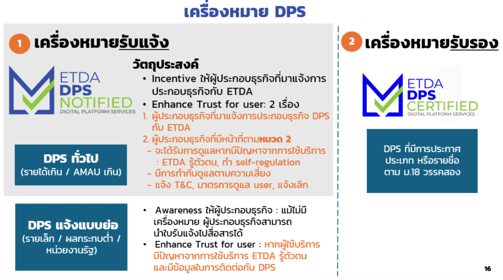 การออกเครื่องหมายรับแจ้ง DPS หรือ “ETDA DPS Notified” เป็นการเพิ่มความเข้มข้นการกำกับดูแลภายใต้กฎหมาย DPS สำหรับแพลตฟอร์มดิจิทัลทั่วไป ที่มีลักษณะตาม ม.8 วรรคหนึ่ง ที่มีรายได้เกิน 1.8 ล้านบาท (กรณีบุคคลธรรมดา) หรือ มีรายได้เกิน 50 ล้านบาท (กรณีนิติบุคคล) หรือ มีผู้ใช้งานเกิน 5,000 คนต่อเดือน (โดยคำนวณจากการใช้งานเฉลี่ยต่อเดือนย้อนหลังตามหลักเกณฑ์ที่สำนักงานประกาศกำหนด) เนื่องจากเป็นแพลตฟอร์มกลุ่มใหญ่ที่ให้บริการแก่คนไทยทั่วไปและอาจเข้าข่ายแพลตฟอร์มที่มีความเสี่ยงสูง และอาจกระทบต่อผู้ใช้งานในวงกว้างได้