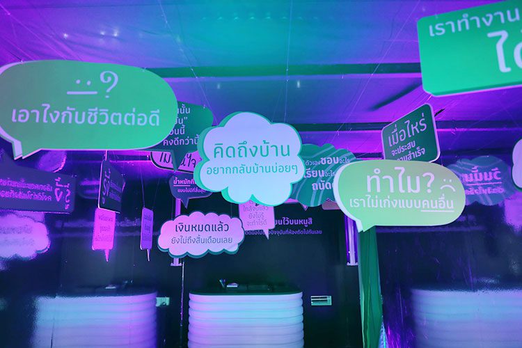 เริ่มด้วย โซน 1 เตรียมโต๊ะ จัดความคิด : แยกแยะความทุกข์ นำทุกคนเข้าสู่โลกของความคิด ด้วยป้ายข้อความมากมายจากอินไซต์ชาว GEN Z และเปิดโอกาสให้ทุกคนเขียนความทุกข์ ความหนักใจ