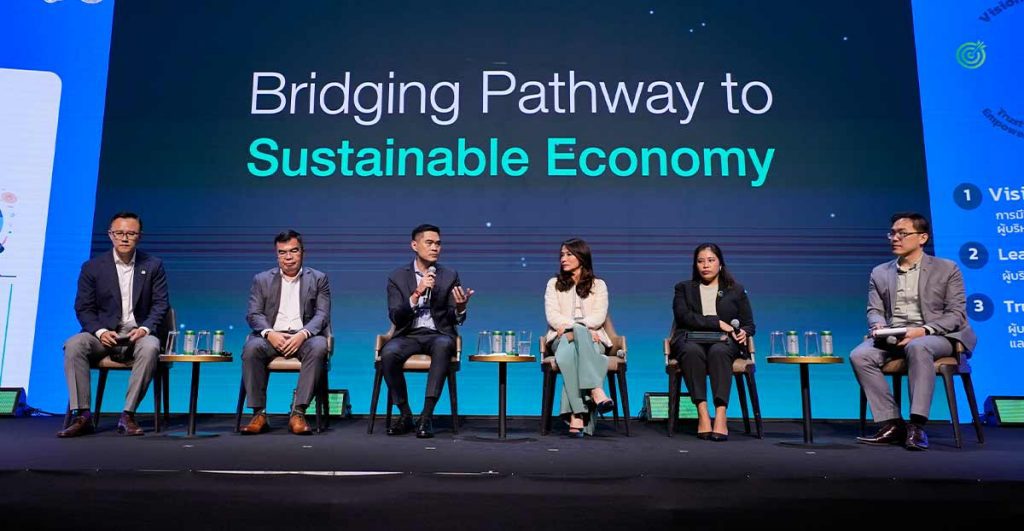 งานนี้ ธนาคารกสิกรไทย (KBANK) จึงได้จัดเวทีเสวนา ภายใต้หัวข้อ Bridging Pathway to Sustainable Economy ขึ้น โดยมี 5 ตัวแทนจากหน่วยงานภาครัฐ เอกชน และรัฐวิสาหกิจ เข้ามาร่วมแบ่งปันวิสัยทัศน์ แนวทาง การลงมือปฎิบัติและคำมั่นสัญญา ที่จะร่วมมือกันสร้าง “ความยั่งยืน” ที่จะกลายเป็นโอกาสสำคัญให้เศรษฐกิจไทยเจริญรุ่งเรืองอย่างทั่วถึงทั่วหน้ากัน