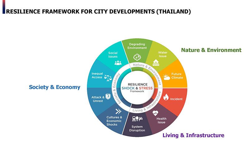 จากแนวโน้มเมืองในอนาคตของไทยที่น่าจะเกิดวิกฤตที่สร้างความตื่นตระหนกและความเครียดต่อผู้คนสูงมาก (Shocks & Stresses) และจากข้อมูลที่บ่งชี้ว่าในอนาคตประชากรบนโลกจะอาศัยอยู่ในเมืองมากถึง 70% รศ.ดร.สิงห์ อินทรชูโต หัวหน้าคณะที่ปรึกษาศูนย์วิจัยและนวัตกรรมเพื่อความยั่งยืน (RISC) จึงมองว่าการแก้ไขต้องเริ่มต้นที่สร้างสังคมเมือง โดยอิงจากกรอบความคิดสำหรับโครงการอสังหาริมทรัพย์ที่พัฒนาขึ้นให้มีความพร้อมรับมือ (resilience) กับความไม่แน่นอนของอนาคตที่จะมาถึง หรือ “Resilience Framework for Future Cities: กลยุทธ์การรับมือเพื่อเมืองแห่งอนาคต” โดยเฟรมเวิร์คนี้ประกอบด้วย กลุ่มปัจจัยความไม่แน่นอนใน 3 ด้าน ได้แก่ Nature & Environment, Living & Infrastructure และ Society & Economy